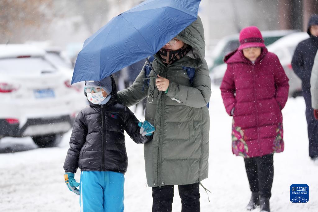 11月23日,哈爾濱市民在雪中送孩子上學(xué)。