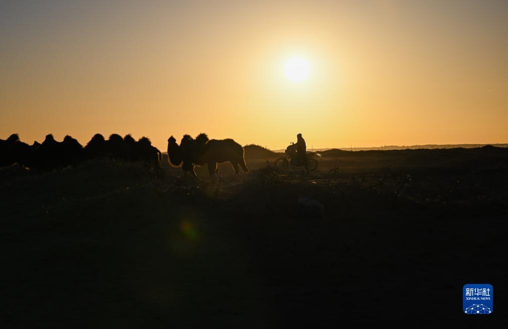 在內蒙古阿拉善左旗烏力吉蘇木溫都爾毛道嘎查,牧民朝勒門(mén)格爾勒在放駱駝(11月17日攝)。