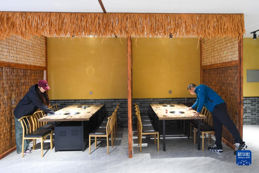 11月23日,在吉林省吉林市永吉縣北大湖鎮南溝村,王雪(左)與家人一起打掃自家民宿的餐廳。