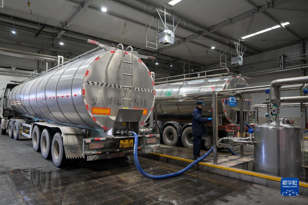 11月23日,在呼和浩特市伊利現代智慧健康谷液態(tài)奶全球智造標桿基地,工人在進(jìn)行收奶作業(yè)。