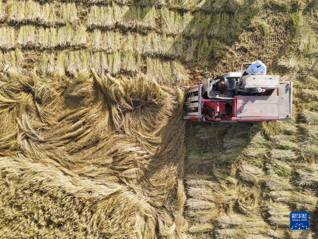 新疆阿拉爾市耐鹽堿水稻測產(chǎn)田塊,人們操作機械收割水稻(10月13日攝,無(wú)人機照片)。