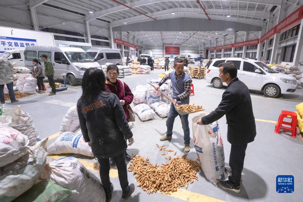 11月23日,在湖北省羅田縣九資河鎮大別山道地藥材產(chǎn)業(yè)園鮮貨交易市場(chǎng),客商在收購藥農的天麻。