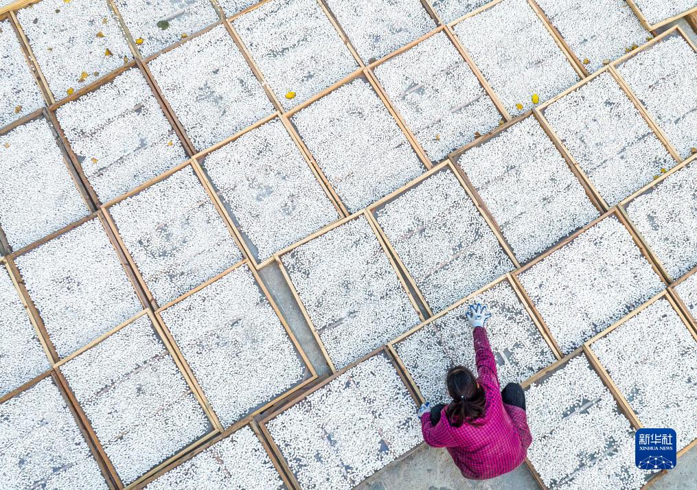 11月23日,在湖北省羅田縣九資河鎮天堂湖村,藥農在晾曬茯苓(無(wú)人機照片)。