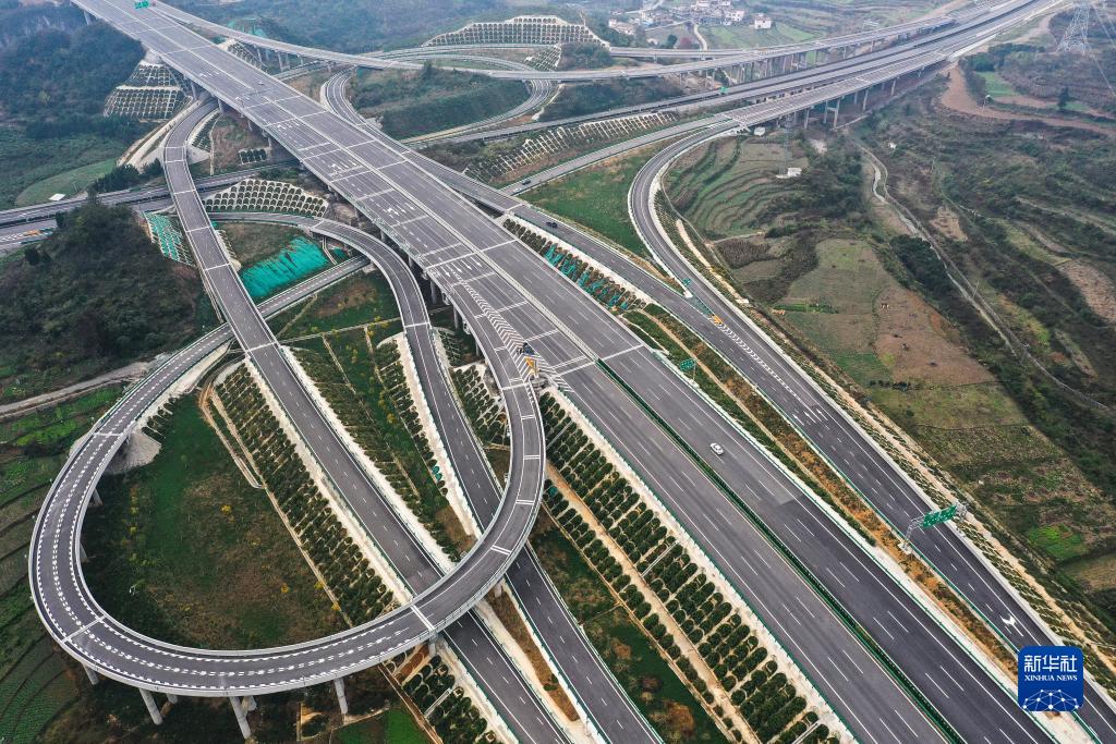 11月24日,車(chē)輛在貴金高速公路郝官樞紐上行駛(無(wú)人機照片)。