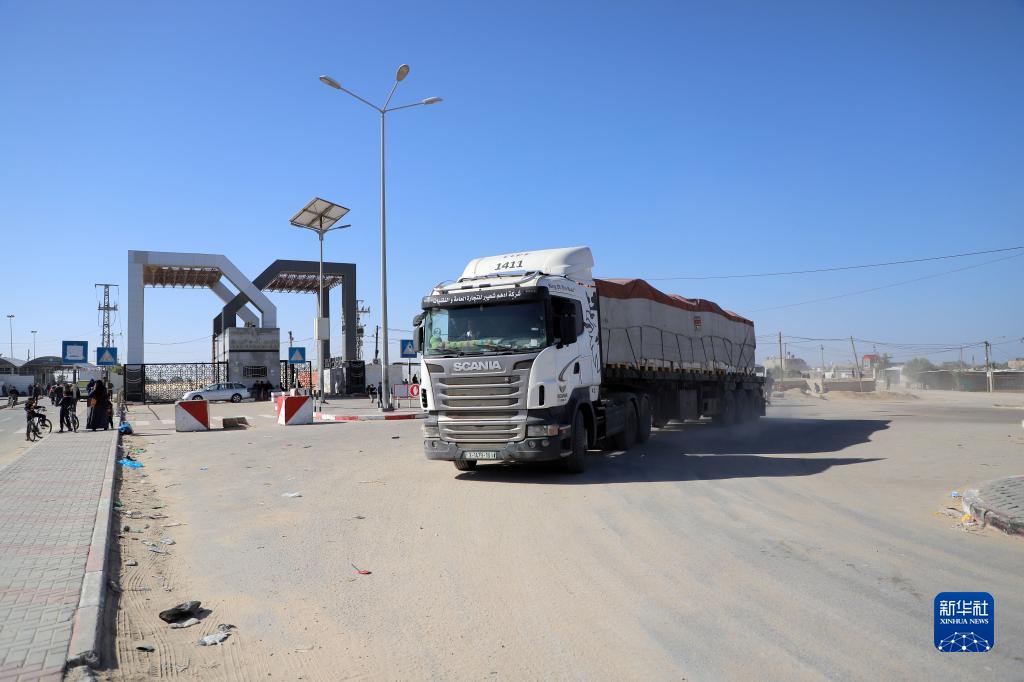 11月24日,運送救援物資的卡車(chē)進(jìn)入拉法口岸加沙一側。