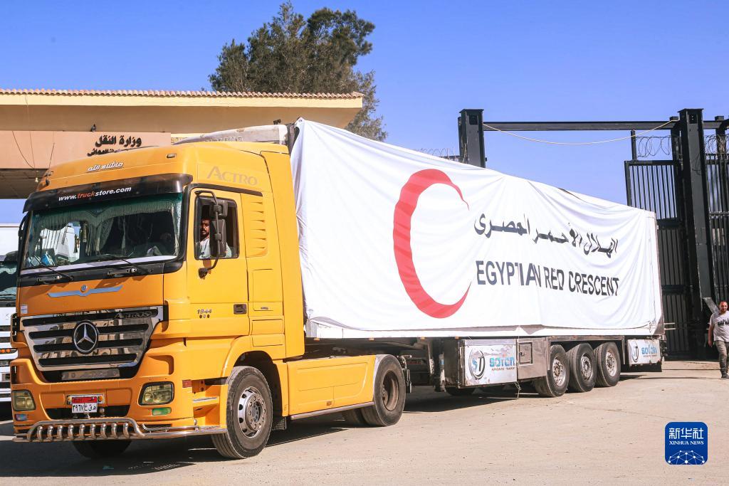 11月24日,完成救援物資運送任務(wù)的卡車(chē)從加沙返回拉法口岸埃及一側。
