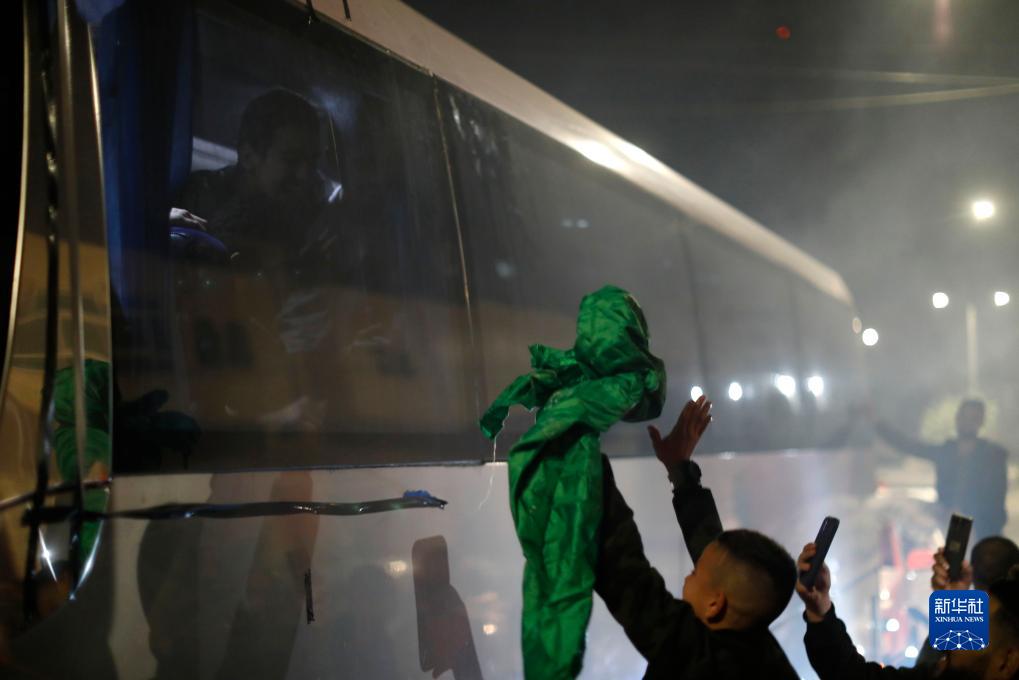 11月24日,在約旦河西岸城市拉姆安拉附近的拜圖尼亞鎮,人們慶祝被關(guān)押的巴勒斯坦人獲釋。