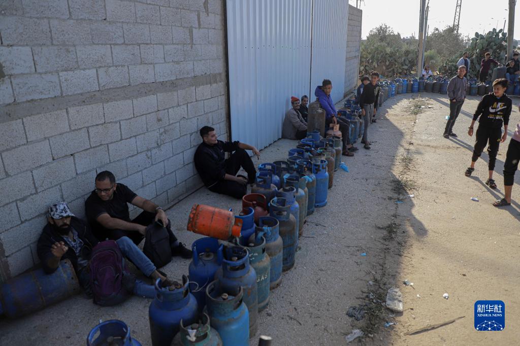 11月24日,在加沙地帶南部城市拉法,人們排隊等待充天然氣。