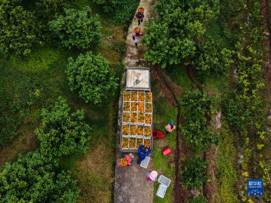 11月24日,在重慶市開(kāi)州區竹溪鎮大海村的一個(gè)柑橘種植基地,村民準備將采摘的砂糖橘裝箱(無(wú)人機照片)。