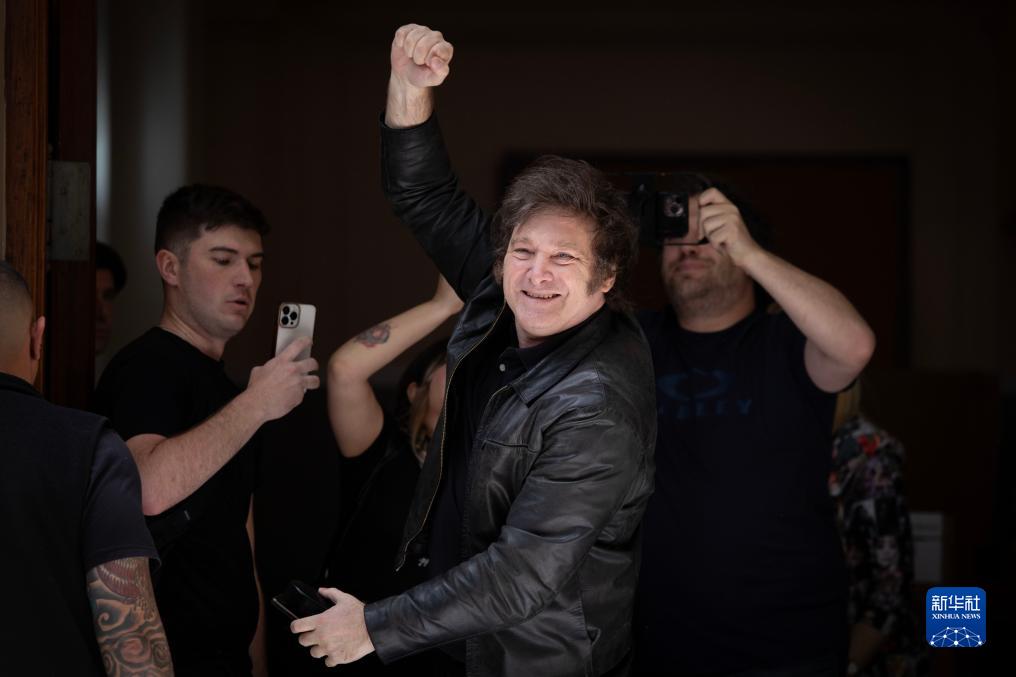 11月19日,阿根廷極右翼選舉聯(lián)盟“自由前進(jìn)黨”候選人米萊在阿根廷首都布宜諾斯艾利斯的一處投票站向民眾致意。