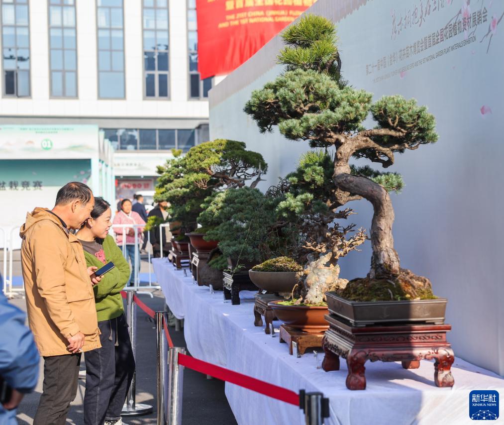 11月25日,客商在觀(guān)看第二十一屆中國(金華)花卉苗木博覽會(huì )上的盆景藝術(shù)展。