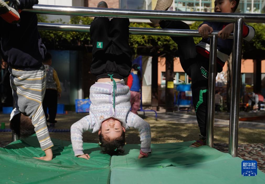 11月24日,在上海市實(shí)驗幼兒園,小朋友玩雙杠。