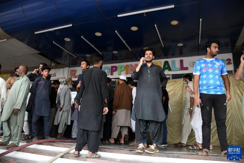 11月25日,在巴基斯坦卡拉奇,人們聚集在發(fā)生火災的商場(chǎng)外。