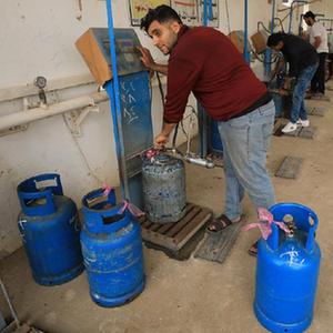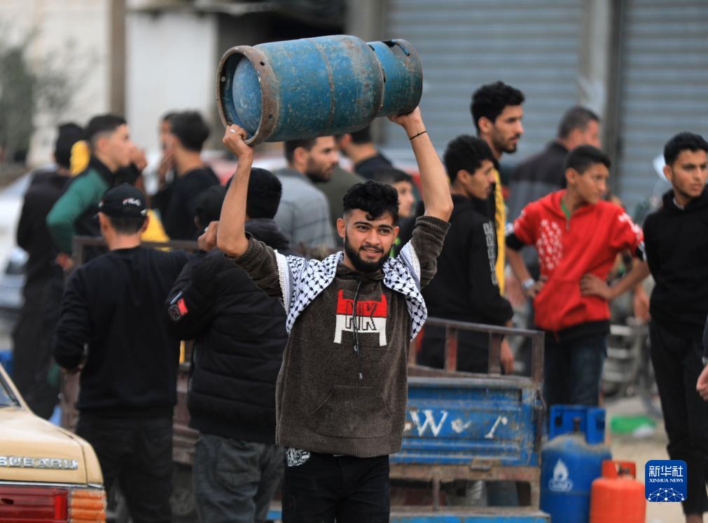 11月25日,在加沙地帶南部城市汗尤尼斯,巴勒斯坦人在充完天然氣后準備返回。