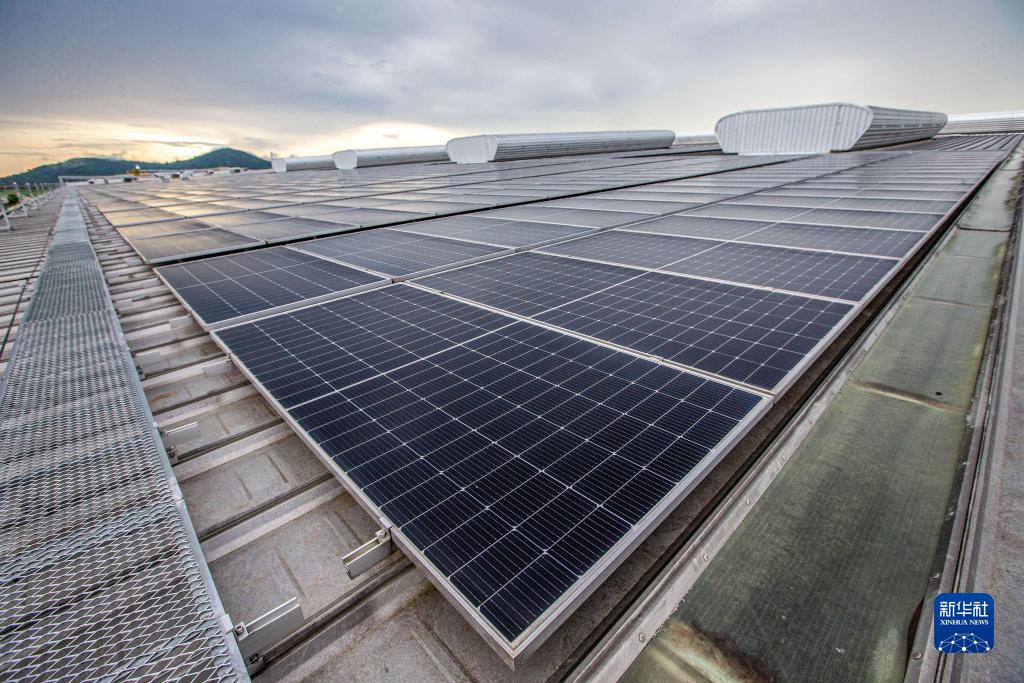 這是11月7日在泰國春武里府拍攝的工廠(chǎng)屋頂光伏發(fā)電項目的光伏發(fā)電板。