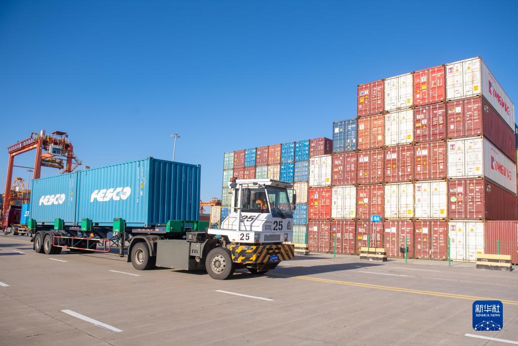11月22日,裝載集裝箱的卡車(chē)行駛在溫州港狀元岙集裝箱碼頭內。