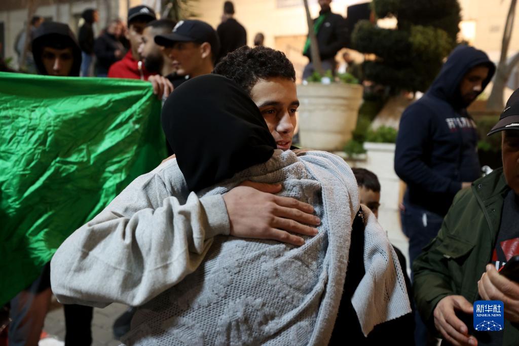 11月26日,在約旦河西岸城市比拉,獲釋巴勒斯坦被關(guān)押人員與親人團聚。