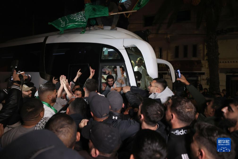 11月26日,載有獲釋巴勒斯坦被關(guān)押人員的大巴抵達約旦河西岸城市比拉。