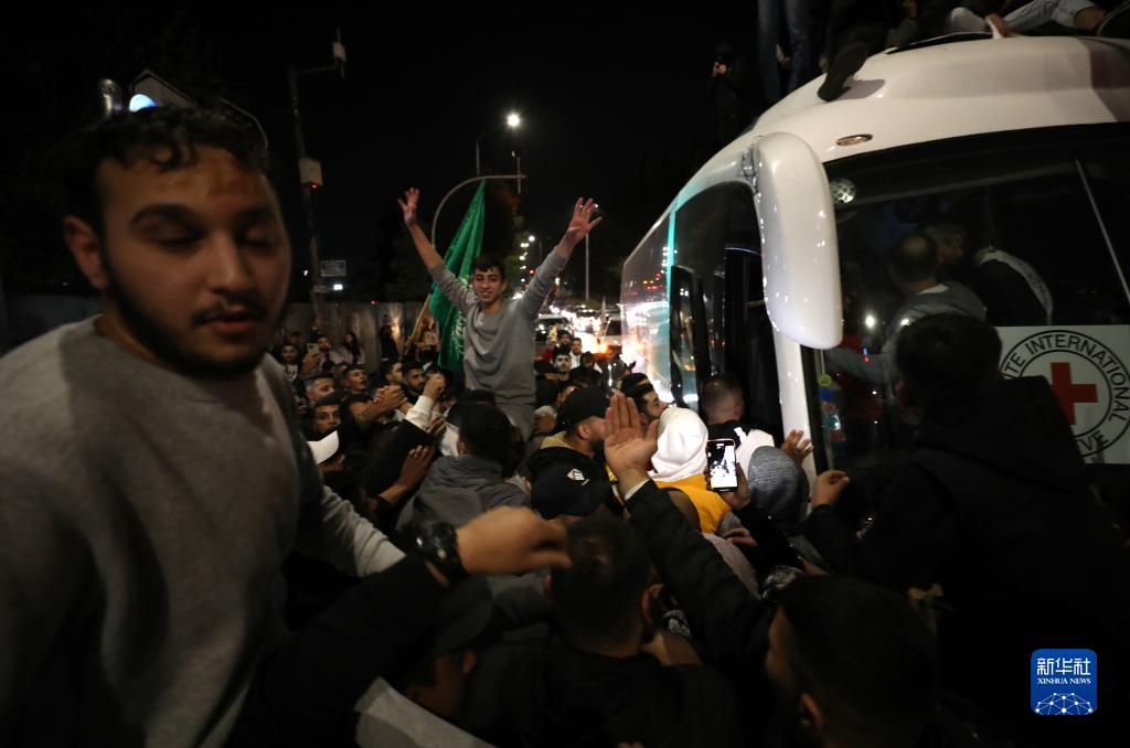 11月26日,在約旦河西岸城市拉姆安拉,人們慶祝被關(guān)押的巴勒斯坦人獲釋。