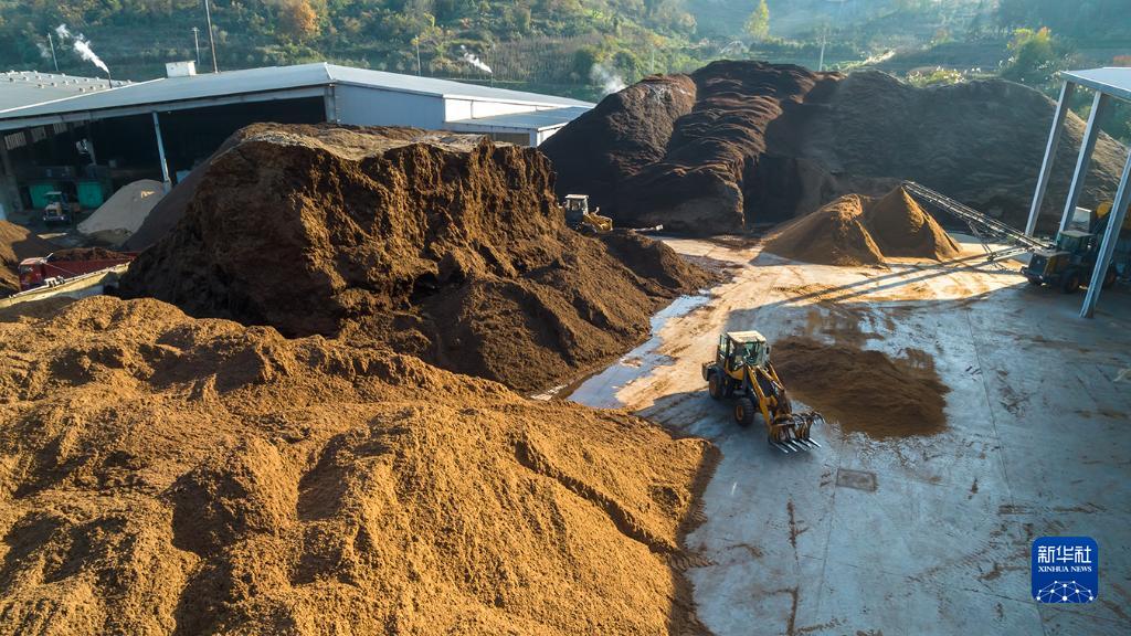 11月27日拍攝的道真仡佬族苗族自治縣尹珍街道一處杏鮑菇種植基地的菌棒原料加工場(chǎng)(無(wú)人機照片)。