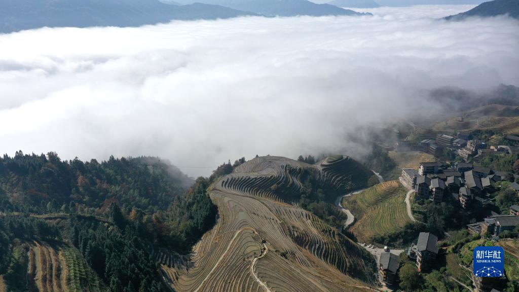 11月27日在廣西桂林市龍勝各族自治縣龍脊梯田拍攝的云海美景(無(wú)人機照片)。