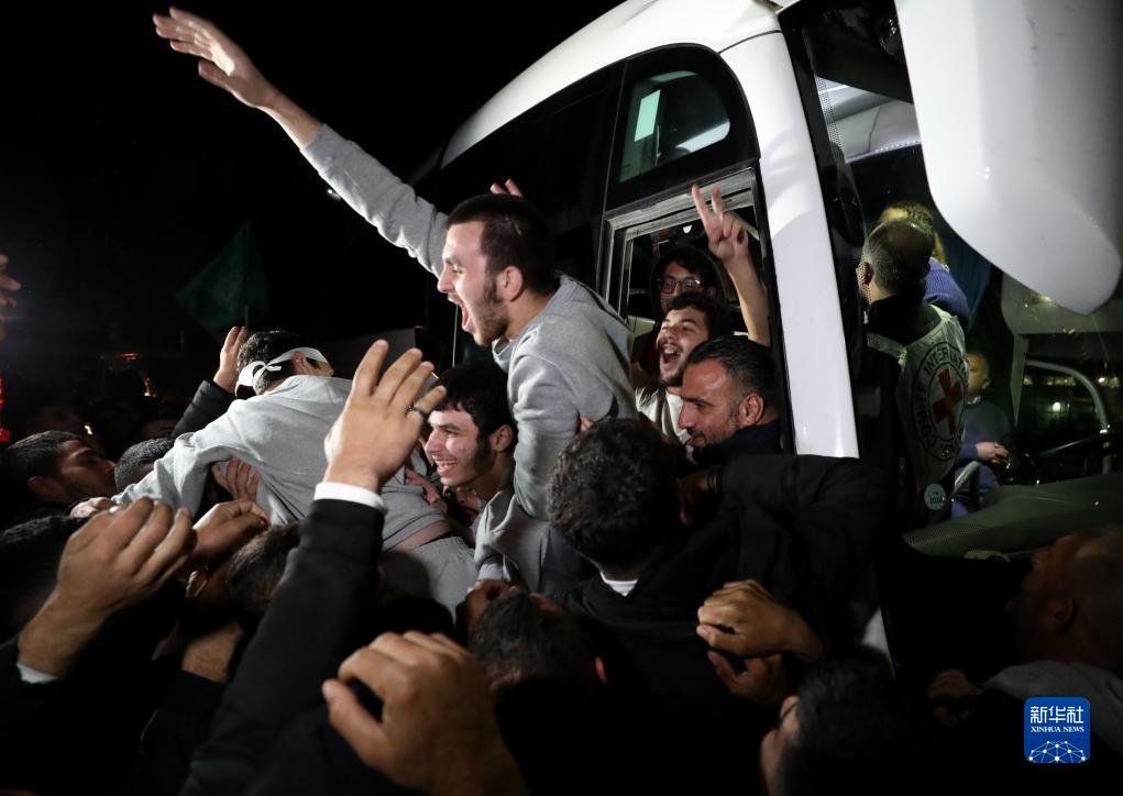 11月28日,在約旦河西岸城市拉姆安拉,人們慶祝被關(guān)押的巴勒斯坦人獲釋。