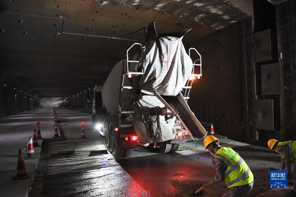 11月28日,工人在深中通道海底沉管隧道內進(jìn)行最后的壓艙混凝土澆筑。