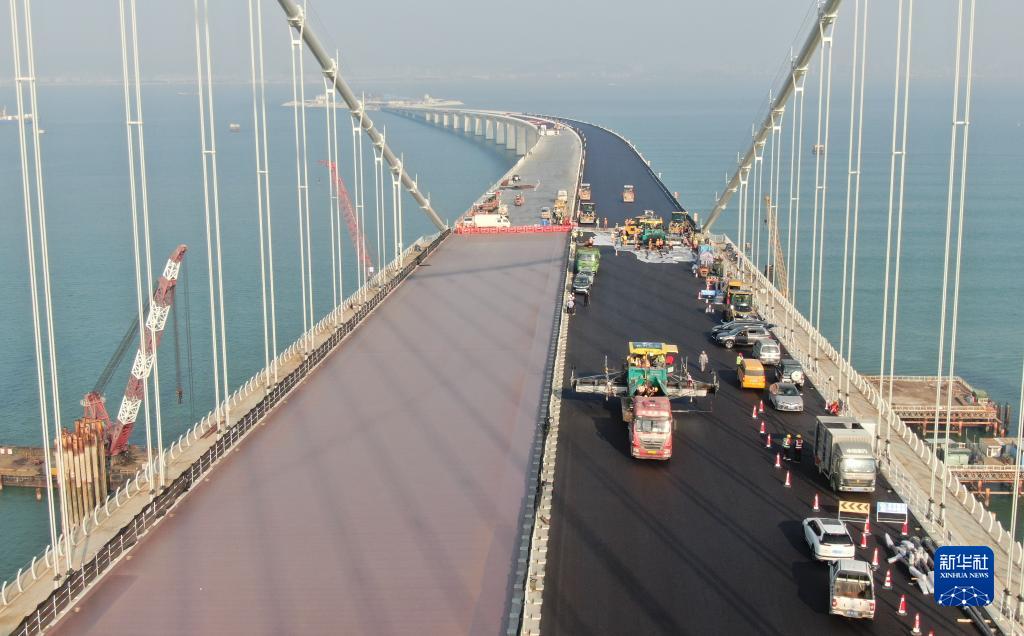 11月27日,保利長(cháng)大工人在深中通道伶仃洋大橋進(jìn)行路面鋪裝工作(無(wú)人機照片)。