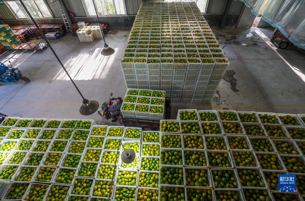 11月28日,浙江省麗水市慶元縣黃壇村的外婆家水果專(zhuān)業(yè)合作社甜桔柚基地的成品倉庫內,工作人員在搬運采摘下來(lái)的甜桔柚。
