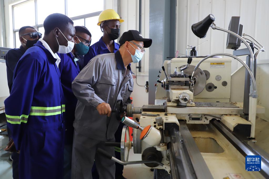 2021年11月9日,在位于烏干達中部穆科諾地區納曼韋工業(yè)園的中國援烏工業(yè)技能培訓與生產(chǎn)中心,一名中方導師為學(xué)員演示如何操作機械。新華社記者 張改萍 攝