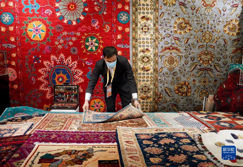 2021年11月8日,工作人員在進(jìn)博會(huì )阿富汗手工羊毛地毯展臺整理商品。新華社記者 劉穎 攝