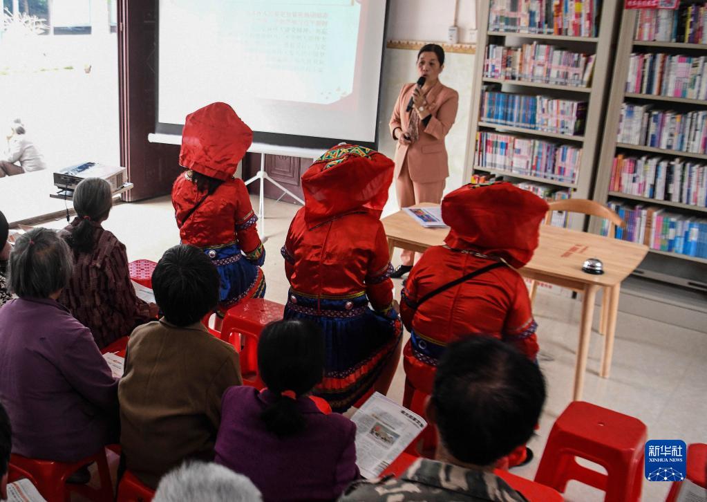 2021年11月19日,在廣西欽州市欽北區大寺鎮那布村農家書(shū)屋,宣講員向村民宣講十九屆六中全會(huì )精神。新華社記者 張愛(ài)林 攝