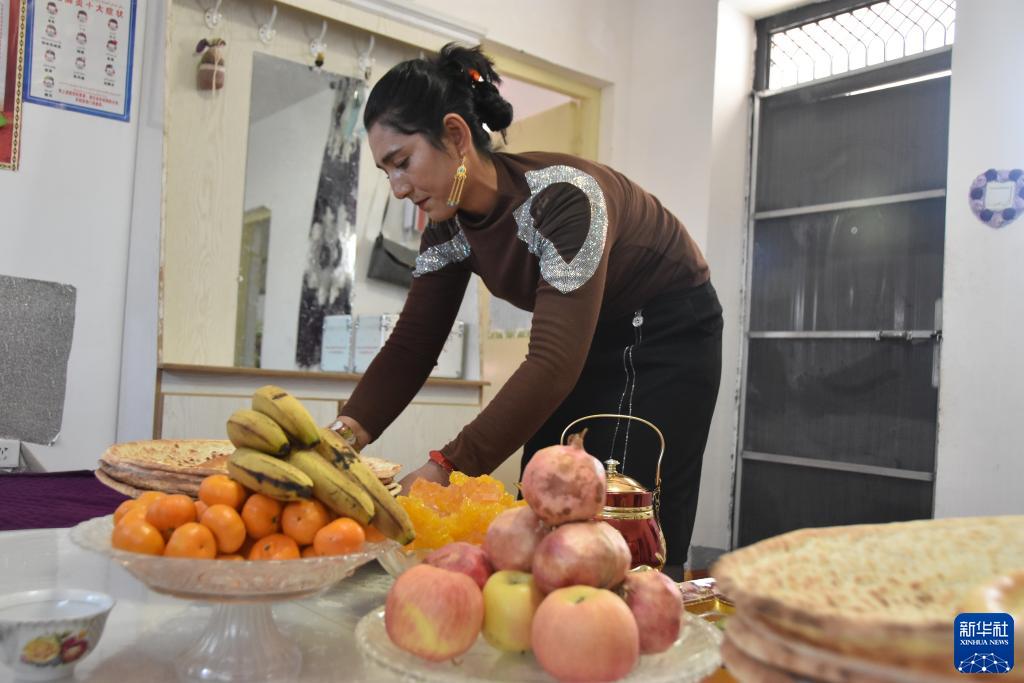 新疆于田縣達里雅布依鄉村民阿米娜·買(mǎi)托合提在寬敞溫暖的家中(2021年11月12日攝)。新華社記者 顧煜 攝