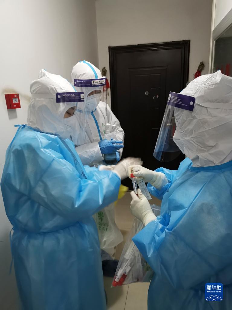 趙洪鑫(中)在入戶(hù)采樣(1月14日攝)。新華社發(fā)
