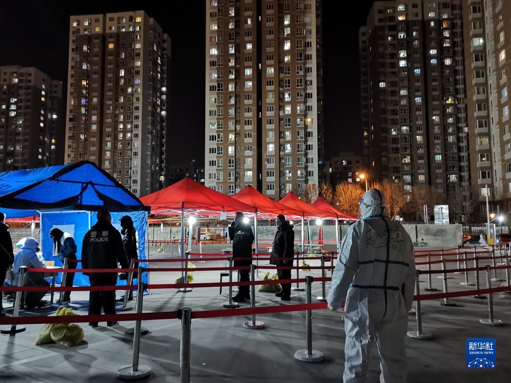 夜間,趙洪鑫(右)組織居民進(jìn)行核酸檢測(1月11日攝)。新華社發(fā)