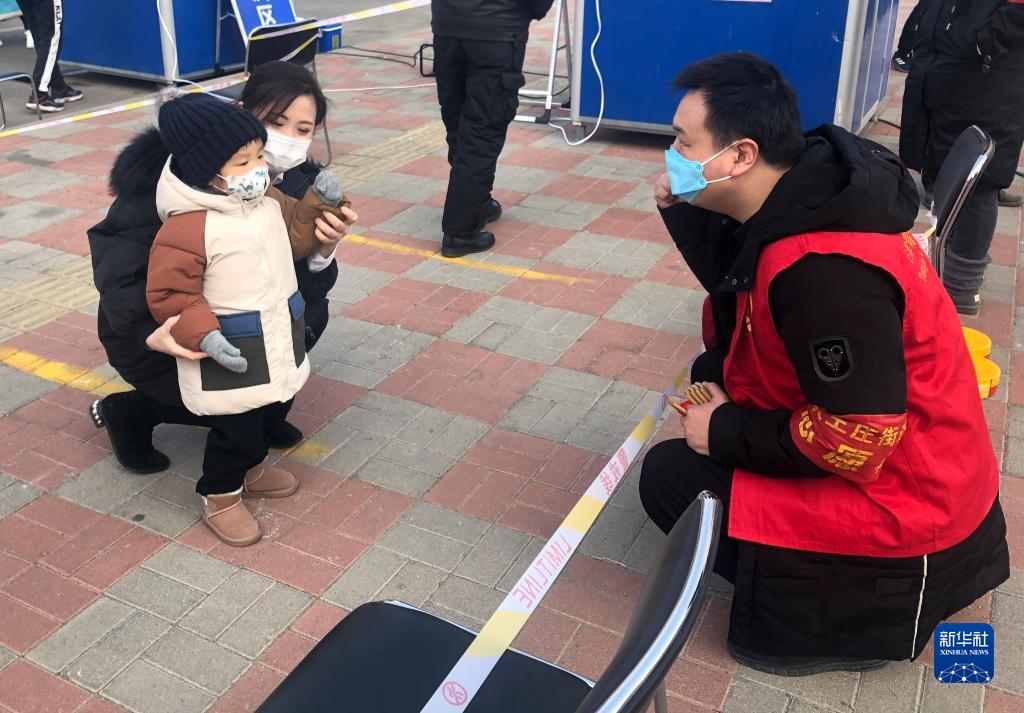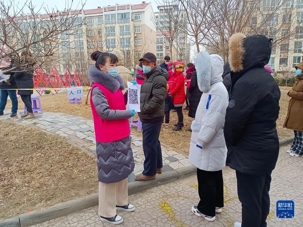 高春燕(左一)幫助前來(lái)核酸檢測的居民進(jìn)行掃碼登記(1月10日攝)。新華社發(fā)