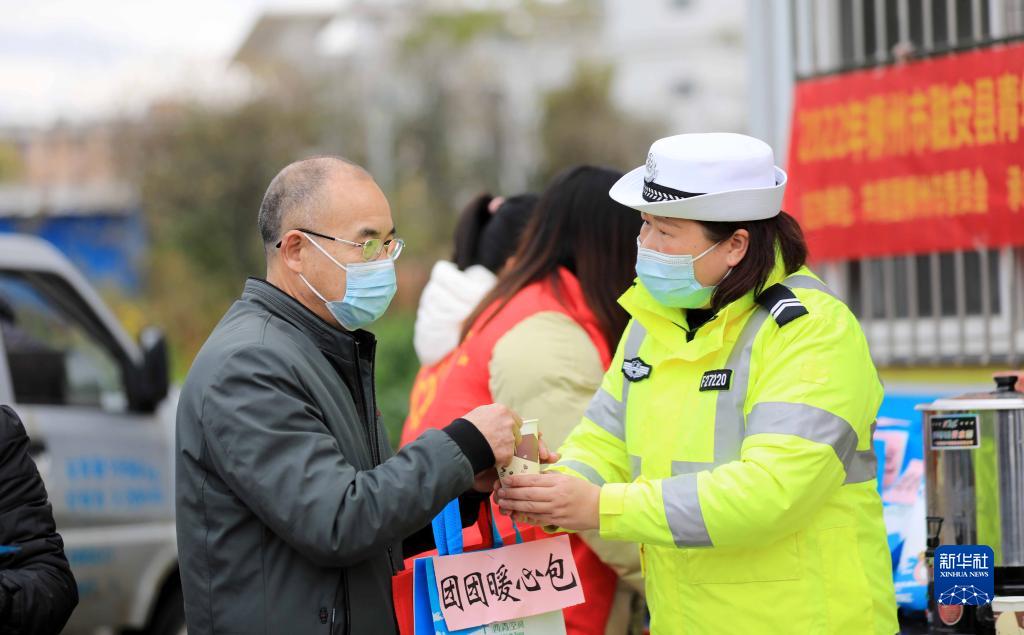 1月17日,在209國道廣西柳州市融安縣段“春運愛(ài)心驛站”,交通輔警為司乘人員送姜糖茶。