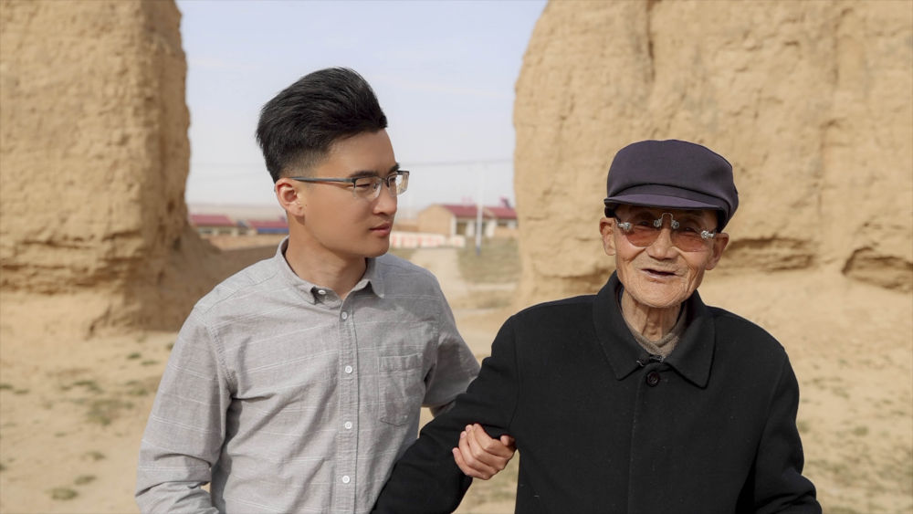 ↑新華社記者馮開(kāi)華(左)向其太爺馮振林了解毛澤民與羊皮大氅的故事(視頻截圖)。