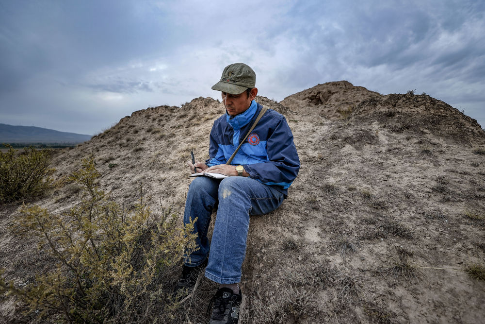 ↑2021年8月12日,李世翔在寧夏海原縣巡查陳家灣烽火臺時(shí)做筆記。