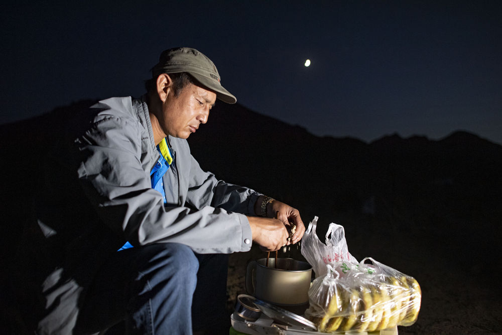 ↑2021年8月13日晚,李世翔在寧夏銀川市境內的三關(guān)口土夯明長(cháng)城附近吃晚飯。為節省時(shí)間和開(kāi)支,他自帶了泡面、餅子和咸菜。