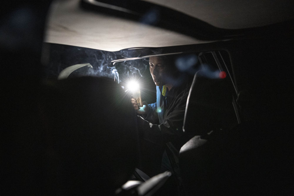 ↑2021年8月13日晚,李世翔在車(chē)里點(diǎn)起蚊香,當晚他在寧夏銀川市境內的三關(guān)口土夯明長(cháng)城附近露宿。