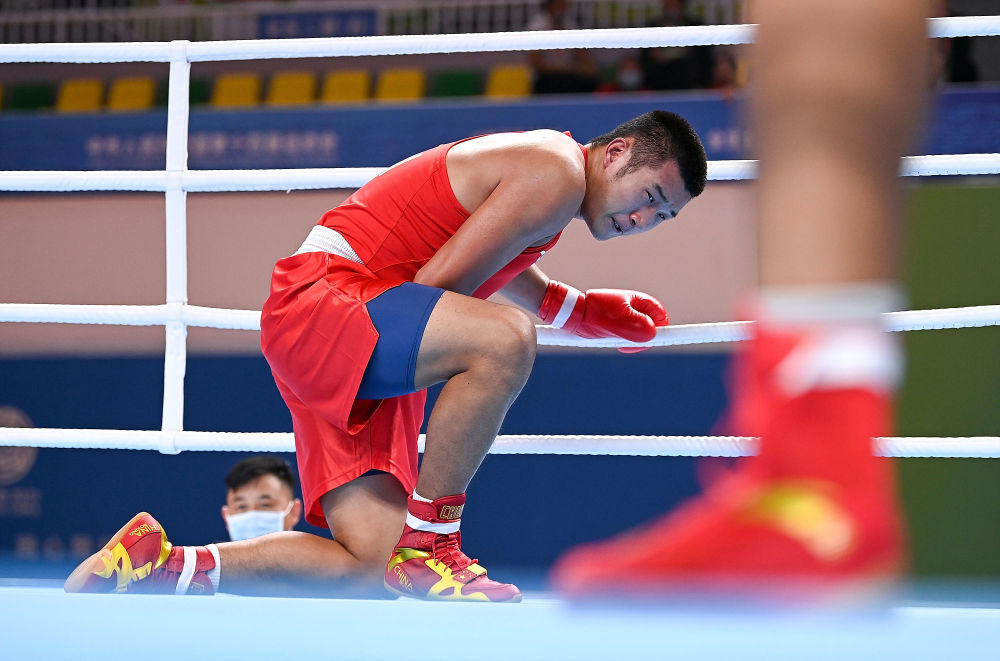↑2021年9月16日,云南隊選手山?。ㄗ螅┡c陜西隊選手阿卜杜熱伊木·麥麥提在男子63公斤級半決賽中。