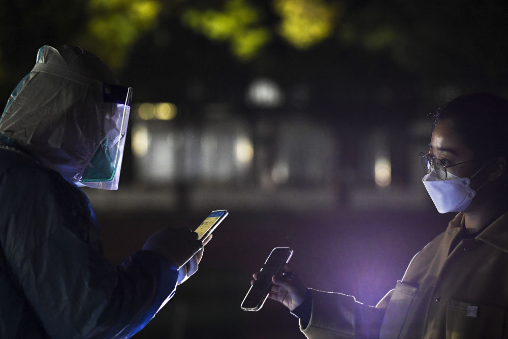 ↑2021年10月23日,在寧夏銀川市金鳳區北京中路街道采樣點(diǎn),醫務(wù)人員(左)在掃碼登記居民信息。