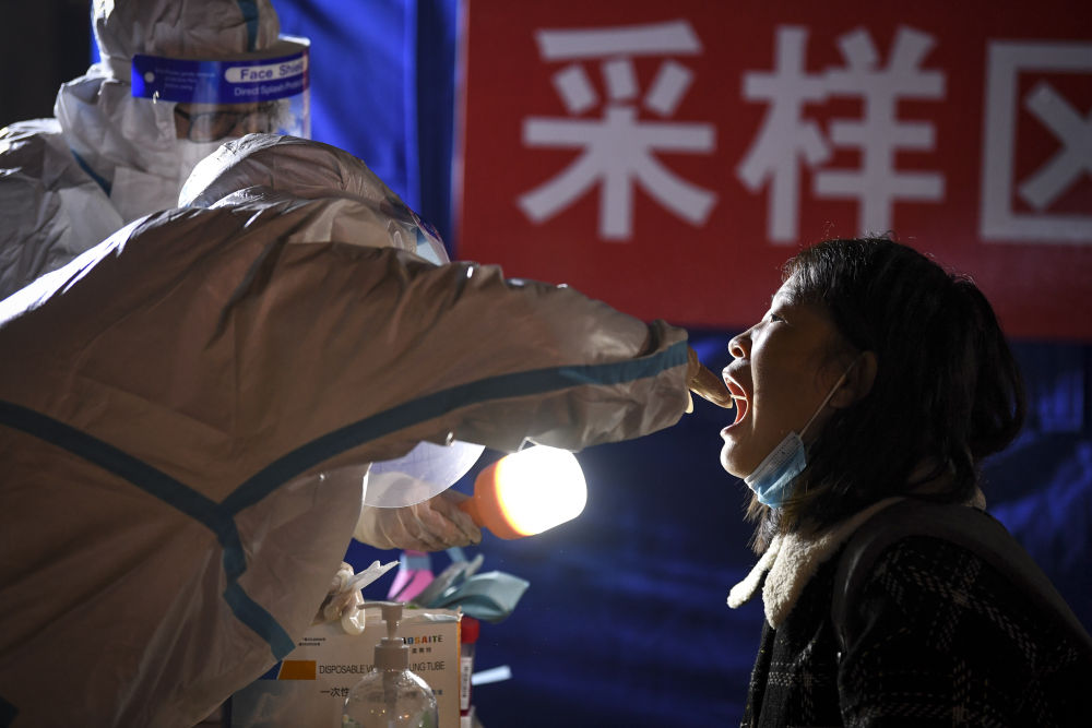 ↑2021年10月23日,在寧夏銀川市金鳳區北京中路街道采樣點(diǎn),寧醫大總院輪轉醫生馬生萍(右二)為居民進(jìn)行核酸采樣。
