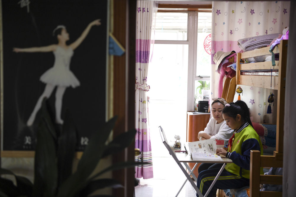 ↑2021年10月25日,寧夏銀川市五年級學(xué)生安思雯(右)在媽媽的陪伴下學(xué)習線(xiàn)上課程。