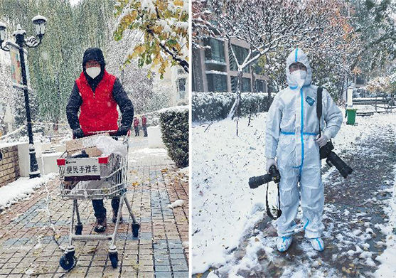 ↑左圖為2021年11月6日上午,新華社記者馮開(kāi)華在銀川市興慶區一處隔離小區做志愿服務(wù);右圖為2021年11月6日下午,新華社記者馮開(kāi)華在銀川市金鳳區一處中風(fēng)險社區采訪(fǎng)。