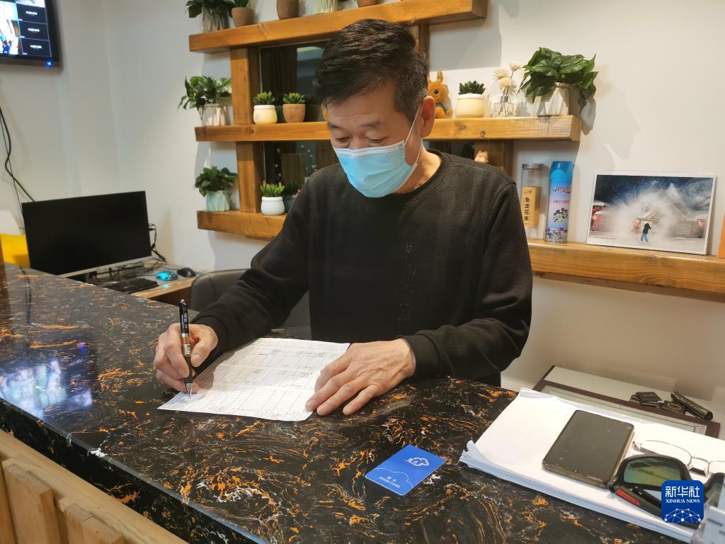 這是2021年1月8日,在黑龍江雪鄉,民宿老板樊兆義在柜臺前核對住客信息。新華社記者 王君寶 攝