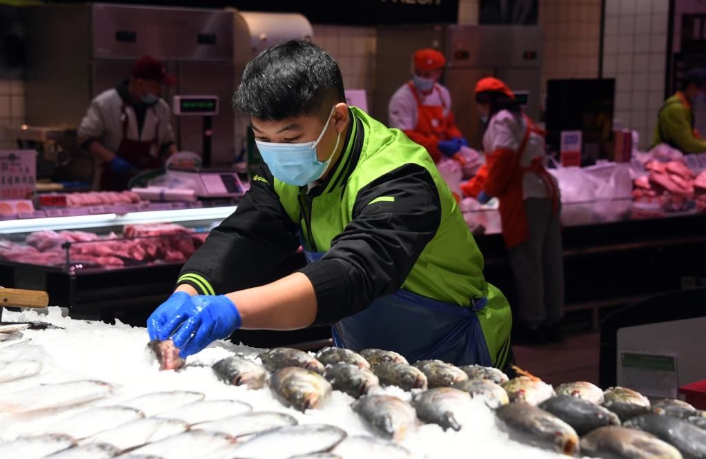 2021年12月31日,在北京市海淀區一家超市,工作人員碼放水產(chǎn)品。新華社記者任超 攝