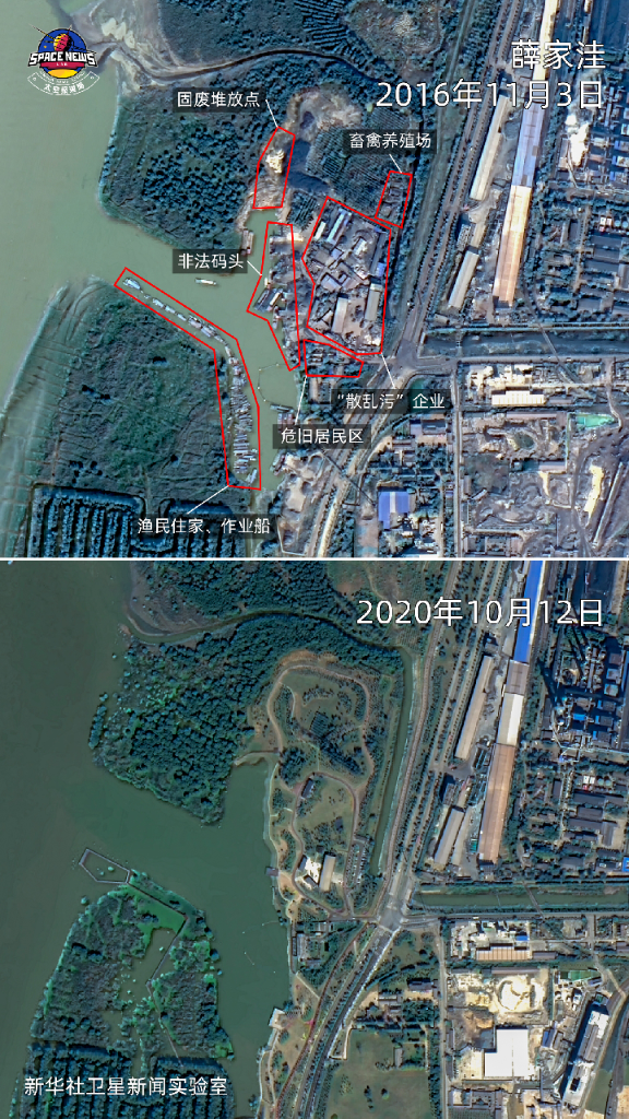 蕪湖十里江灣便是其中之一。衛星“跨越時(shí)空”拍攝的圖片顯示,蕪湖十里江灣船舶中介、運輸繁榮一時(shí),導致固廢堆放、岸邊毀綠種菜等亂象叢生。2021年11月3日的衛星圖顯示,這里擁擠雜亂的工廠(chǎng)、漁船和裸露的地塊均已消失,宛如披上一層“綠衣”,郁郁蔥蔥的林木間,整潔的步道沿江蜿蜒。