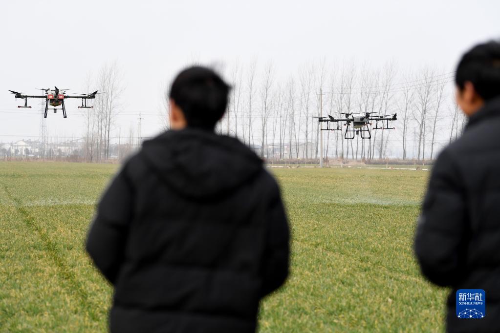 2月11日,無(wú)人機在安徽省亳州市趙橋鄉“無(wú)人農場(chǎng)”噴灑除草劑。新華社記者 劉軍喜 攝